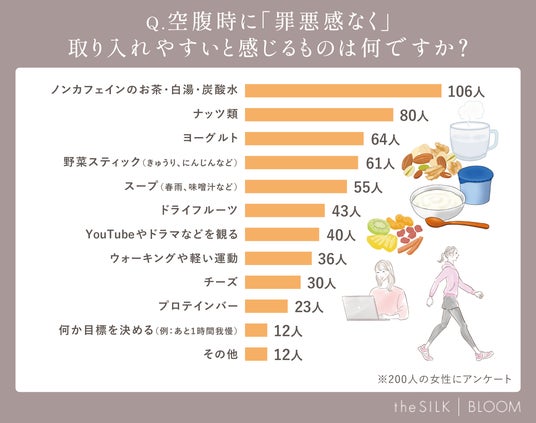本調査は、20代から60代以上の女性200人を対象に実施し、年齢や職業の幅広い層の空腹時の対処法を分析しました。