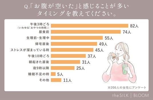 調査の結果、現代女性の空腹タイミングは「午後3時ごろ」が200名中82名(41%)が回答と最も多く、いわゆる「おやつの時間」における空腹感が多くの女性に共通する現象であることが明らかになりました。