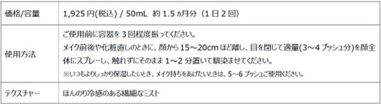 メイクの仕上げにひと吹きするだけで、大人の肌にうるおいやハリを与えながら、メイクをピタッと密着。メイクくずれを防ぎ、涼しげで艶やかな美肌が長時間持続します。