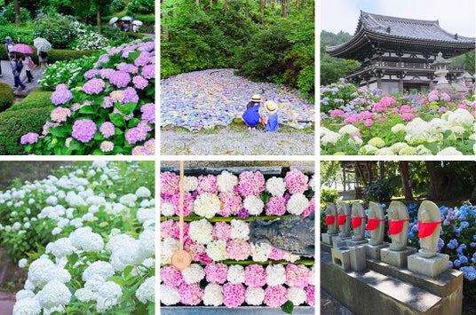 設置施設のイメージ。左上から時計回りに、21世紀の森公園(岐阜県関市)、みちのくあじさい園(岩手県一関市)、丹州観音寺・華観音寺(京都府福知山市)、国営昭和記念公園(東京都立川市/昭島市)、柳谷観音 楊谷寺(京都府長岡京市)、有珠善光寺(北海道伊達市)