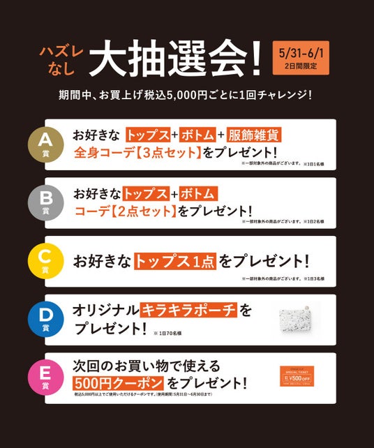 5月31日(土)~6月1日(日)の2日間限定で、税込5,000円以上ご購入ごとに1回ご参加いただける大抽選会を開催。全身コーディネートやOFFクーポンなど、夏のファッションを楽しめるお得なプレゼントをご用意いたします。