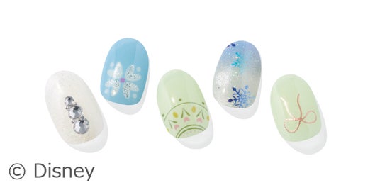 N / FROZEN ¥2,200(税込)『アナと雪の女王』にインスピレーションを受けた爽やかなムードのネイルデザイン。幼少期のアナとエルサのドレスをモチーフにしたパターンポイントやリボンがキュート。オラフをイメージしたカスタムパーツとスノーフレークドローイングが指先で煌めきます。ブルーとグリーンのソルベカラーが涼し気で愛らしいデザインです。