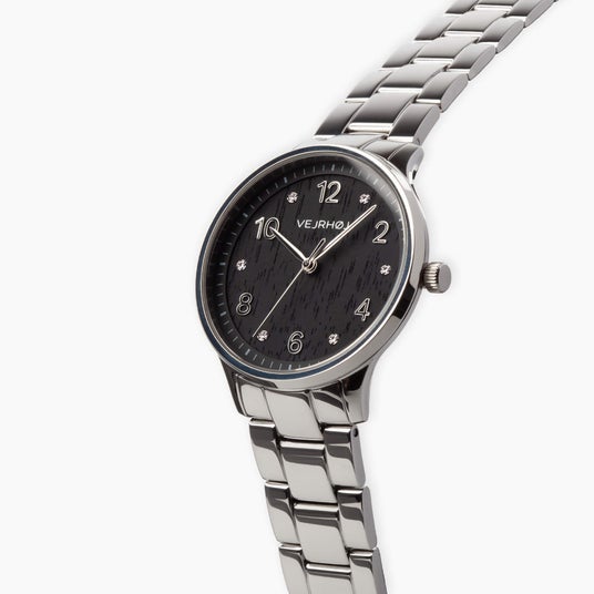 こちらのコレクションの中でも特に人気のあるモデルの一つは、時刻表示に輝く石を使用している点が特徴です。これらの石は光を美しく反射し、日常にさりげないきらめきを添えてくれます。