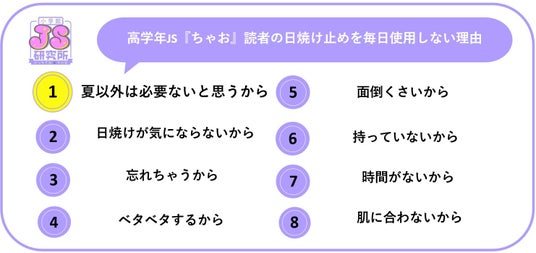 また、「ほぼ使わない」(16%)と「使ったことがない」(6%)を合わせた「使わない派」が22%いる一方、「毎日使う」という、季節に関係なく紫外線を気にしている美容意識の高いJSも10%いることがわかりました。