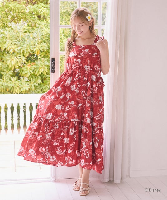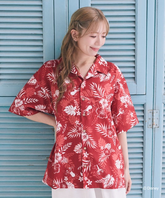 作中で「リロ」が着ているレッドのアロハ柄の洋服からインスピレーションを得たシャツとワンピースは、柄の中に「スティッチ」と「スクランプ」が隠れた遊び心のあるデザインで、夏のリゾートにもぴったりです。