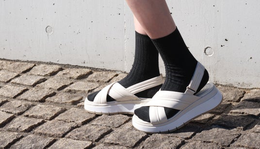 太めのレザーストラップが足をしっかりと包み込み、ベルクロ仕様のバックストラップで着脱もスマー