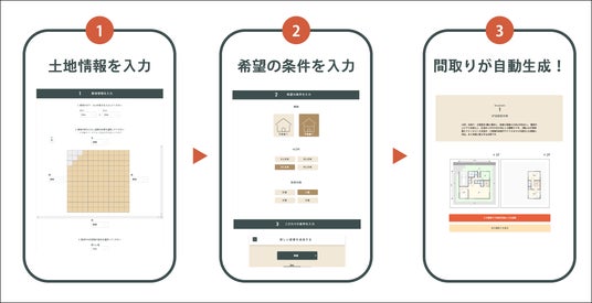 直感的な操作で情報を入力すると、最短3分で最大18パターンの多種多様な間取りが出力される