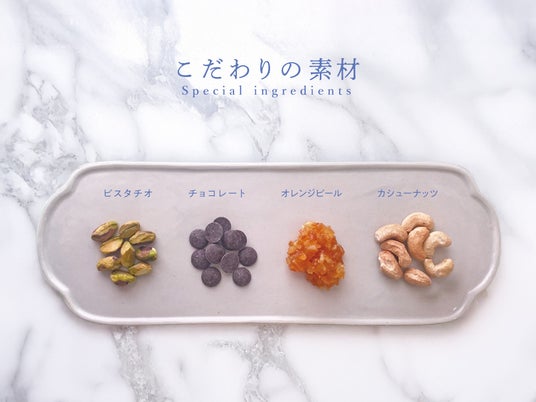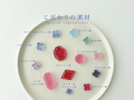 原材料:砂糖(国内製造)、クリーム、乳等を主原料とする食品(生乳、乳清、クリーム)、カシューナッツ、オレンジピール、ビターチョコレート、ピスタチオ、マスカットリキュール、寒天、ラズベリーリキュール、ピーチリキュール、ココナッツリキュール、かぼす果汁、ブルーベリーリキュール、コーンスターチ、ミント/トレハロース、安定剤(加工デンプン、ペクチン(オレンジ由来)、カラギナン)、着色料(スピルリナ青、クチナシ黄、アントシアニン、ビートレッド、銀)、レシチン、酸味料、香料、(一部に乳成分・オレンジ・カシューナッツ・大豆・もも含む)