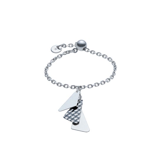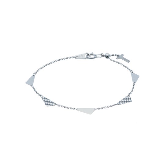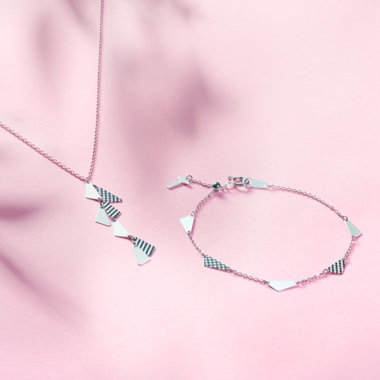 ネックレスは45cmと60cmの2 種類があり、胸元に純プラチナの洗練された輝きを演出します。同じく、トライアングルパーツをあしらったブレスレットとリングは、装った腕や指が動くたびに軽やかにきらめきます。人気アイテムであるピアスはチェーンがエレガントに揺れるアメリカンタイプを採用しました。どのアイテムも光のあたる角度によって幾何学模様と鏡面仕上げのパーツが異なるきらめきを放ちます。