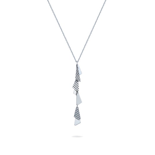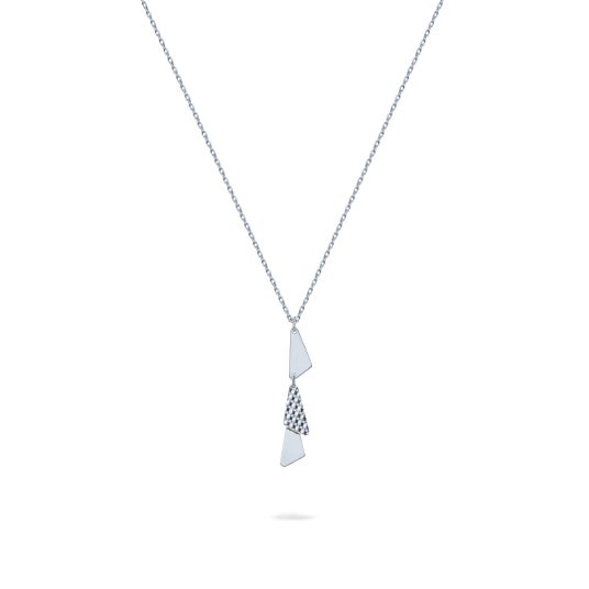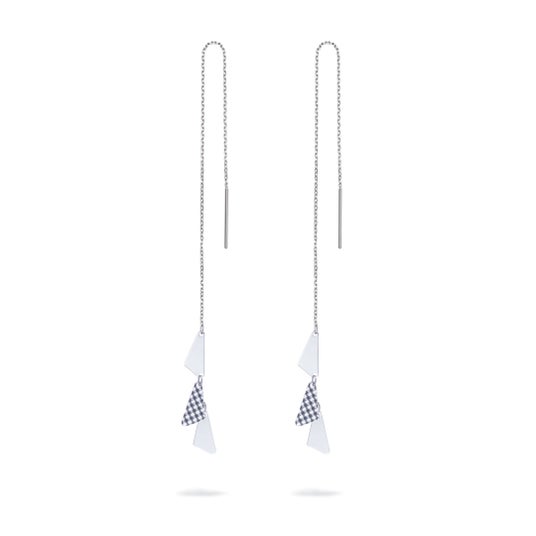 ギンザタナカの新作「プラチナ・ウーマン」は、トライアングルのフォルムの純プラチナパーツを印象的にあしらった純プラチナ・ジュエリー全5アイテムです。トライアングルのパーツは幾何学模様を施したものと鏡面仕上げのふたつのタイプを組み合わせて、モダンなイメージをつくっています。