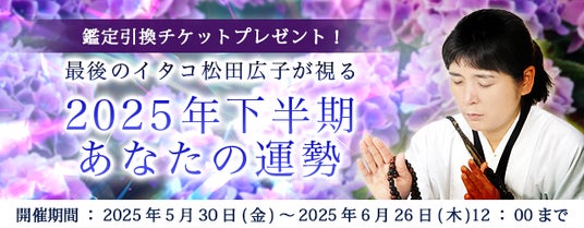松田広子の公式占いサイト「恐山の秘術【最後のイタコ】松田広子」では、『2025年下半期あなたの運勢キャンペーン』を開催中です。2025年もそろそろ折り返しとなる今、残り半年間を幸せに過ごしていただけるよう、あなたの2025年下半期の運勢を視通す鑑定をご用意いたしました。