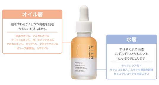 “LIEM ORGANICS(リエムオーガニック)”は「マタニティライフをもっと楽しく、もっと幸せに」をコンセプトに、2025年3月にデビュー。第2弾となるウォータリーオイルは、“すばやく浸透する水層”と“うるおいを逃さないオイル層”の2層タイプ。いつものお手入れにプラスするだけでスキンケアの浸透力をアップして、ごわつき・ざらつきのない、もっちり柔らかい肌にみちびきます。