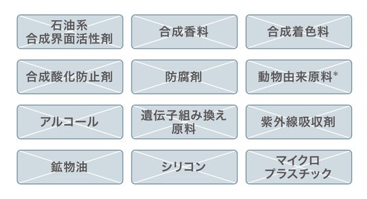 <12項目の無添加>刺激をあたえる余計な成分は入れず、肌へのやさしさを追求しました(微生物由来原料及びハチミツ、ミツロウを除く)。