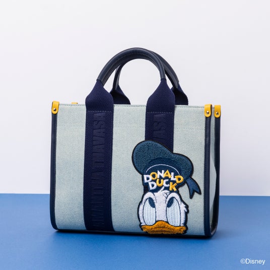 「ドナルド」と「デイジー」のアートを相良刺繍のワッペンでデザインしたバッグ。
