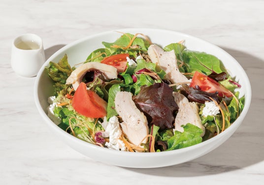 ハーブチキンとカッテージチーズのサラダ 1,380円(税込)鶏むね肉をハーブや調味液に漬け込み、低温でボイルしたオリジナルサラダチキンと、穀物やカッテージチーズを添えたグリーンサラダです。