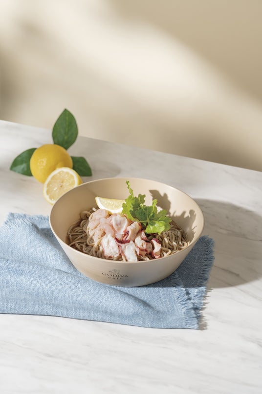 「甘海老と蛸の柑橘香味蕎麦~カカオ黒七味添え」 1,210円GODIVA cafe 東京店・飯田橋店・みなとみらい店・日本橋店・大宮店・二子玉川店・越谷イオンレイクタウンmori店