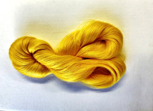 ■富岡シルク ぐんま黄金生糸この天然色である黄色の色素は、セリシン部分(繭糸の表面部分)に多く含まれており、精練工程により色が落ちてしまいます。