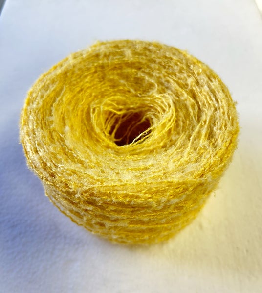 ネット状のネップがあり、ふんわりとした嵩高な絹糸です。触っていると、保湿効果のあるセリシン成分で手先がスベスベになります。