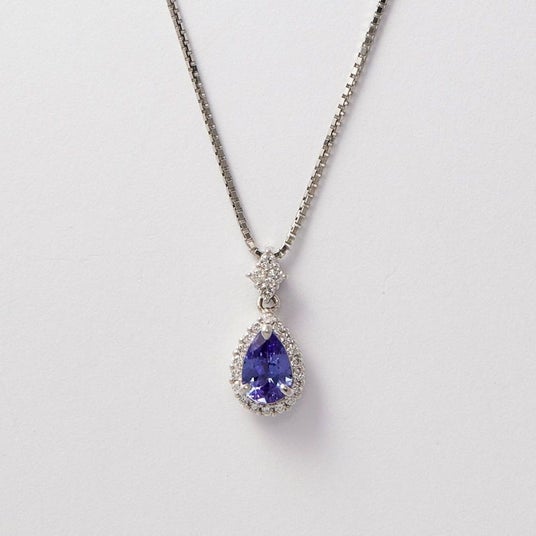 0.35ctのタンザナイトを中心にメレダイヤで囲んだペアシェイプのプラチナネックレス。トップとチェーンをつなぐ部分にもダイヤモンドがあしらわれた美しいアイテムです。