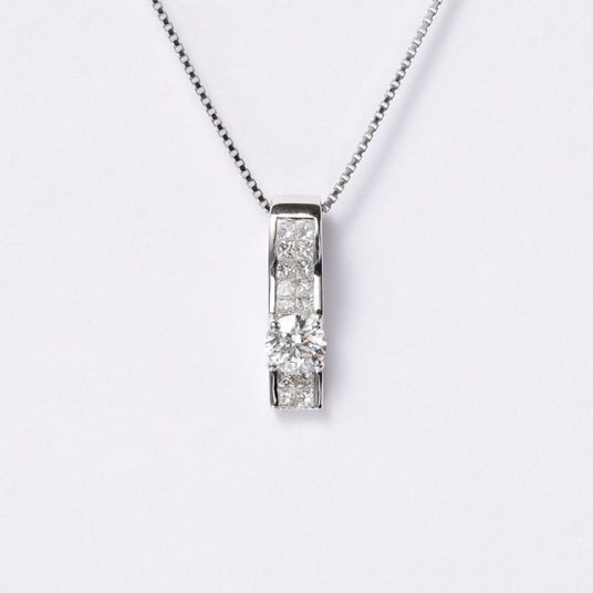 石畳のように敷き詰めたプリンセスカットダイヤの上に0.3ctのダイヤでアクセントをつけたペンダントネックレス。ゴージャスなデザインは大人の女性の魅力を引き立たせます