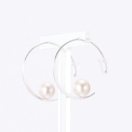 K18ホワイトゴールドのフープにパールがついたピアス。6mmのパールが華奢なホワイトゴールドについたデザインはとても芸術的です。