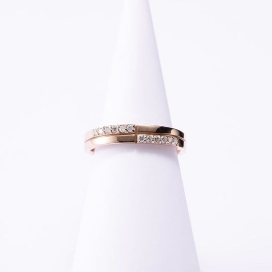 K18ピンクゴールドにメレサイズダイヤモンドを個性的にセッティングしたラインリングです。気取らないデザインなので普段使いに最適です。