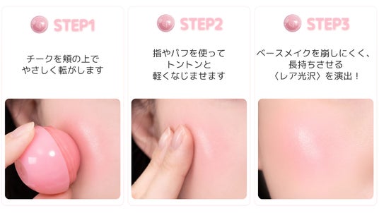 ベースメイクを崩さずに、ジューシーなレア光沢頬を演出できます。