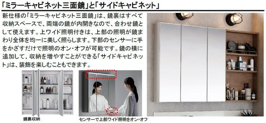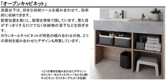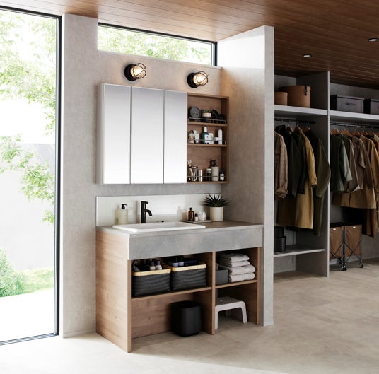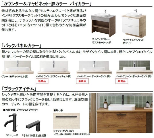 洗面台下のキャビネットにオープンキャビネットを品揃えし、好きな収納ツールを組み合わせて、自分らしい収納を楽しめます。化粧鏡はミラーキャビネット三面鏡を2タイプ追加、鏡横にはサイドキャビネットも新たに品揃えします。カウンターやキャビネット・扉カラーは、素材感のある柄と質感を品揃えし、選ぶ楽しみが広がります。水栓金具と扉の取っ手にブラックアイテムを追加、シックな洗面空間を作ることもできます。