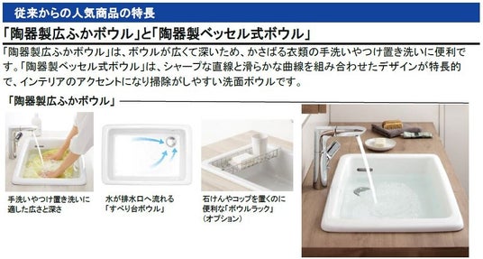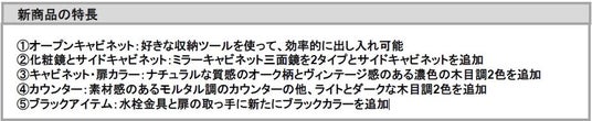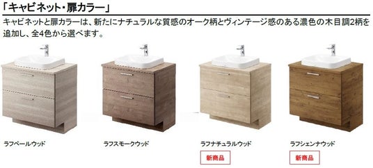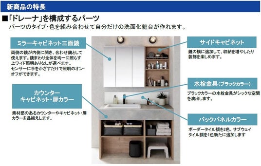 「ドレーナ」は、洗面ボウル、水栓金具、カウンター、鏡、キャビネットなどのアイテムや色を組み合わせて造作するように、自分好みの洗面化粧台を作ることができる人気の商品です。この度、発売する「ドレーナ」は、素材感や色味にこだわったアイテムを追加しました。