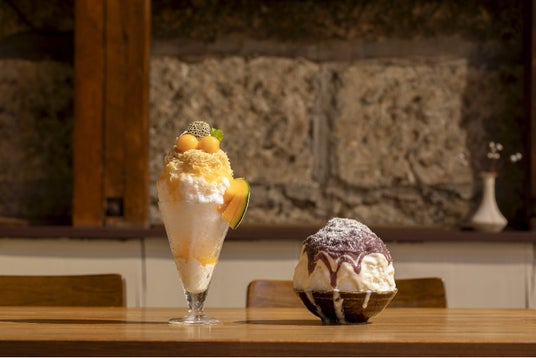 【実演】<Wagashi>左: かき氷 - 大豆餡/メロン/杏仁 - 2860円 右:かき氷-小豆餡/柚子/酒粕- 2420円