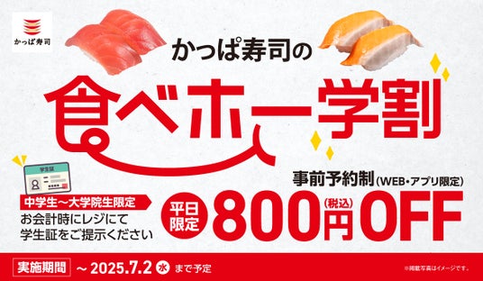 コロワイドグループのかっぱ寿司(カッパ・クリエイト(株) 本社:神奈川県横浜市、代表取締役社長:山角豪)は、大変ご好評いただいている食べ放題「かっぱ寿司の食べホー」について、“うちの街にも来てほしい!”の声にお応えし、新たに20店舗、計179店舗で実施いたします。あわせて、現在SNSを中心に大きな反響をいただいている『かっぱ寿司の食べホー 平日学割』も、引き続き延長いたします。