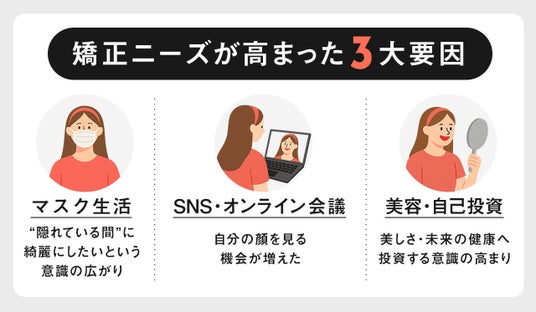 コロナ禍によるマスク生活で"矯正中の見た目を気にせず治療できる環境"が生まれたことや、オンライン会議やSNSを通じた"自分の顔を見る時間の増加"、さらには"美容や健康への自己投資意識の高まり"が大きな要因と考えられます。