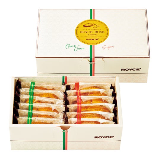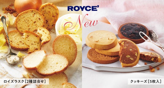 この2つの焼き菓子に、[チーズ&オニオン]と[シュガー]2つの味わいを楽しめる「ロイズラスク[2種詰合せ]」と、バラエティ豊かな5つの味わいを楽しめる「クッキーズ[5枚入]」が新たにラインナップに加わりました。