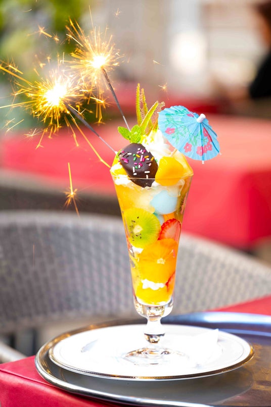フルーツの花火、ラムネシャーベットやチョコバナナ、レモネードジュレを一つのパフェにギュッと凝縮。ミルク濃厚なソフトクリームを絞りアメでできたパイナップルの葉を飾った、まるで夏祭りのようなパフェです。ドリンクは、コーヒー、ニルギリ紅茶、ハーブティーからお選びください。