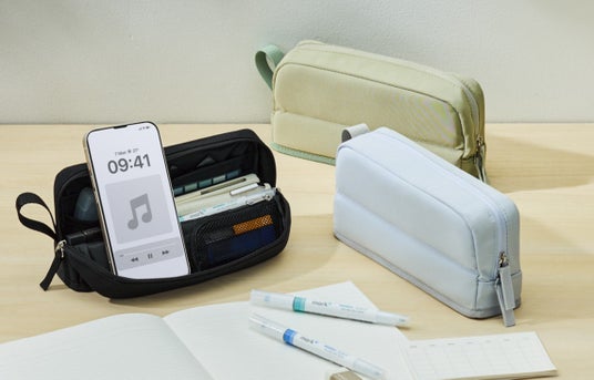 2023年10月に発売の「ツールペンケース<カバコ>」は、複数のペンと文具一式をまとめて持ち運びたいというニーズに応えた大容量のペンケースです。大容量ながら中身が見やすく、仕切りやファスナー付きのメッシュポケットで中身を整理整頓しやすいと好評いただいています。この度、スマホやタイマーを立てかけておけるスペースを備えた新たな仕様をラインアップに追加します。