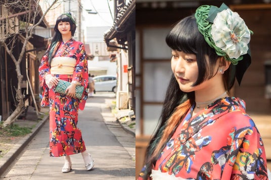 鮮やかな赤地に個性的な柄が映える、モダンな浴衣スタイル。自由で華やかなコーデが印象的。大きな花飾りとグリーンのバッグがアクセントになり、レトロな街並みにもぴったり。歩くたびに視線を集めます。