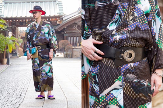 大胆なグラフィック柄が目を引く、クールなメンズ浴衣スタイル。ニューヨークやメキシコの旅から着想を得たデザインに、レザーベルトの斬新なアレンジ。ハットとサングラスでモード感をプラスし、伝統と現代が融合した着こなしに。