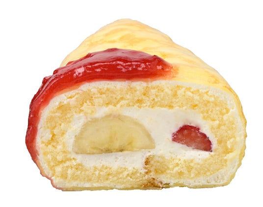 特長:まるでオムライスに見えるかわいいスイーツ!苺とバナナ、クリームを包んだスポンジを、さらにクレープ生地で包み、ストロベリーソースとピックを飾って仕上げました。