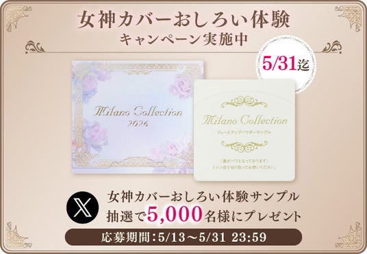 さらに、ミラノコレクション公式Xにて抽選で5,000名様に当たる「女神カバーおしろい体験サンプルキャンペーン」を5月31日(土)迄実施中です。