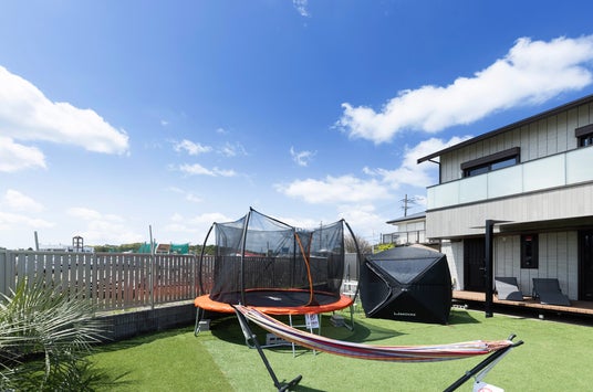 ▪️トランポリン&ハンモック▪️ トランポリンとハンモックも設置しており、子どもから大人まで楽しめるリラックス空間が広がります。トランポリンで体を動かしてリフレッシュしたり、ハンモックに揺られながら読書や昼寝を楽しんだり、思い思いの過ごし方が可能。自然の中で心も体も開放される癒しのひとときをお過ごしください。