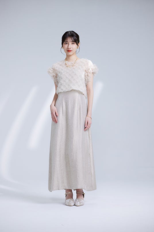 2wayチュールブラウスカップ付きワンピース存在感たっぷりの立体チュールブラウスが目を惹くドレスです。