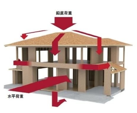 ツーバイフォー工法の特長であるモノコック構造は、基本となる枠組みと、床・壁・屋根を6つの面として建物を支える強靭な構造のこと。高い強度と揺れの抑制が求められる航空機や自動車のボディの技術が活かされおり、この剛性の高い構造が地震の揺れを受け止めて分散し、建物全体で抵抗することで優れた耐震性能を発揮します。