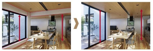 従来のツーバイフォー工法は、高強度なモノコック構造を保つためにも、窓の上端、バルコニーへのまたぎ、部屋内のさがり壁など、壁材が必要になる個所がありました。壁そのものが進化した「MOCX WALL 工法」では、開放感のあるスッキリと端正な住まいのデザインを実現することが可能になりました。