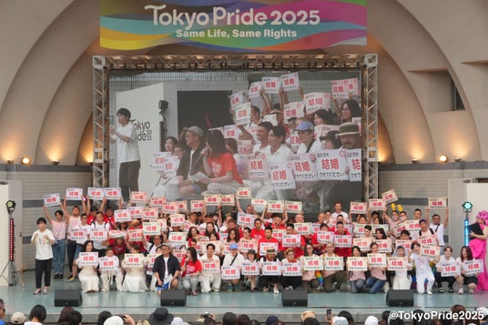 プライドパレード終了後は、婚姻の平等(同性婚)実現のために活動する団体・Marriage For All Japanに参加した、50組100名の法律上同性どうしのカップルがプライドフェスティバルのステージに登壇。100名が一斉にメッセージカードを掲げ、同性婚法制化への願いを力強く発信。それぞれの愛の形を称えながら、「私たちを結婚させてください」と結婚の自由を求めるメッセージが来場者一人ひとりに届けられました。