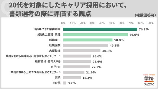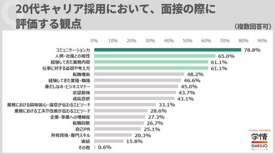 株式会社学情(本社:東京都中央区)は、企業・団体の人事担当者を対象に、「20代キャリア採用で評価するポイント」についてインターネットアンケートを実施しました。20代を対象にしたキャリア採用の書類選考での評価ポイントは、「経験してきた業務内容」76.2%、「経験した職種・業種」66.6%がトップ2でした。これに対し、面接での評価ポイントでは、「コミュニケーション力」78.8%、「人柄・社風との相性」65.0%がトップ2に。多くの企業が、まず書類選考でこれまでの業務や職種・業種といった経験を確認したうえで、その後の面接では基本的なコミュ力や人柄、社風との相性重視の選考で採用を決めていることが分かりました。