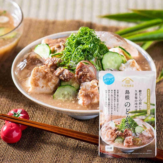 鰹だしの利いた久世福の冷や汁 島根のどぐろ希少な高級魚である「のどぐろ」を使用した、贅沢な冷や汁です。久世福商店の看板商品「風味豊かな万能だし」と九州の麦みそをベースとした汁に、島根県産で水揚げされたのどぐろを加えました。