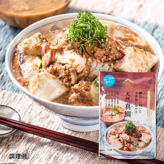 鰹だしの利いた久世福の冷や汁 天然真鯛瀬戸内で獲れた真鯛の旨みが楽しめる、さっぱり上品な冷や汁です。ひんやりとした真鯛の身が温かい口の中でほろほろとほぐれ、くせのない上品なおいしさが口いっぱいに広がります。
