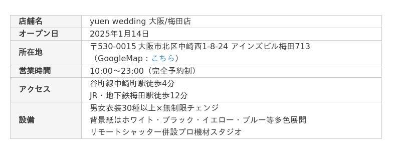 セルフフォトウェディングスタジオ「yuen wedding(ユエン・ウェディング)」を運営する合同会社yuen(本社:東京都/代表:福田拓実)は、2025年1月、大阪・梅田に2店舗目のスタジオを開設いたしました。