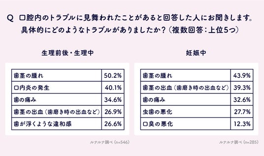 生理前後・生理中、妊娠中に口腔内トラブルに見舞われた人は、どういった症状を抱えていたのでしょうか。