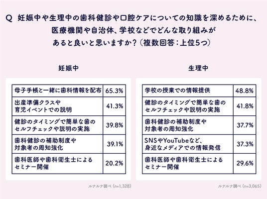 最後に、妊娠中の歯科健診や口腔ケア、生理中の口腔ケアに関する知識を深めるためにどんな取り組みがあると良いと思うかを聞きました。